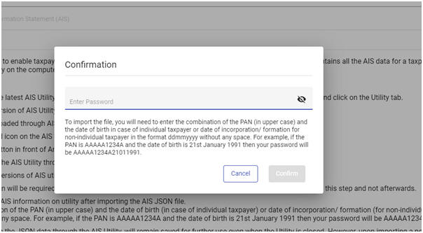 फ़ाइल आयात करने के लिए, आपको पैन के संयोजन (ऊपरी मामले में) और व्यक्तिगत करदाताओं के मामले में जन्म तिथि या गैर-व्यक्तिगत करदाता के लिए DDMMYYYY के प्रारूप में निगमन/गठन की तिथि बिना किसी के दर्ज करनी होगी। अंतरिक्ष। उदाहरण के लिए, यदि पैन AAAAA1234A है और जन्म तिथि 21 जनवरी 1991 है तो आपका पासवर्ड AAAAA1234A21011991 होगा।