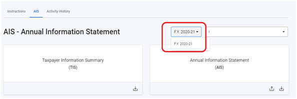 चरण 5: 'एआईएस' के अगले टैब पर क्लिक करें। पुनर्निर्देशित स्क्रीन पर, दो टाइलें दिखाई देंगी - करदाता सूचना सारांश (टीआईएस) और वार्षिक सूचना विवरण (एआईएस)। ड्रॉप-डाउन से प्रासंगिक वित्तीय वर्ष का चयन करें और जानकारी देखने के लिए एआईएस टाइल पर क्लिक करें।