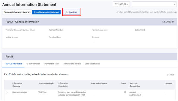 चरण 2: एआईएस तक पहुँचने पर, निर्धारिती को निम्नलिखित टैब में भाग ख के तहत चयनित वित्तीय वर्ष के लिए व्यापक जानकारी मिलेगी: